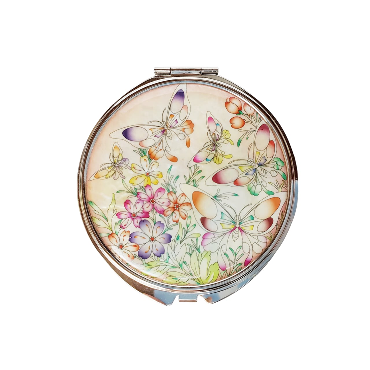 華やかな蝶とお花がデザインされた美しい螺鈿細工の手鏡です。