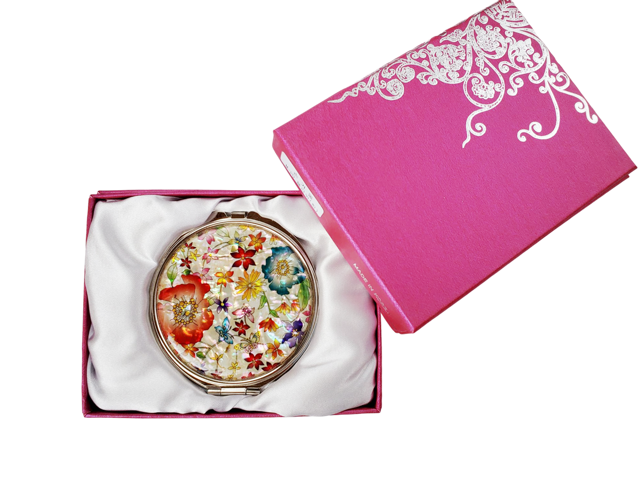 華やかなお花と小さな蝶がデザインされた美しい螺鈿細工の手鏡です。